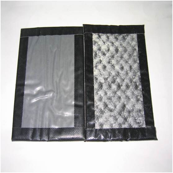 编织布为载布,撒土装置将膨润土铺在编织布上,经刮刀调整膨润土厚度,然后上层覆盖无纺布,通过针刺机的刺针将无纺布上的纤维固结到下层编织布上,形成稳定的三明治结构。