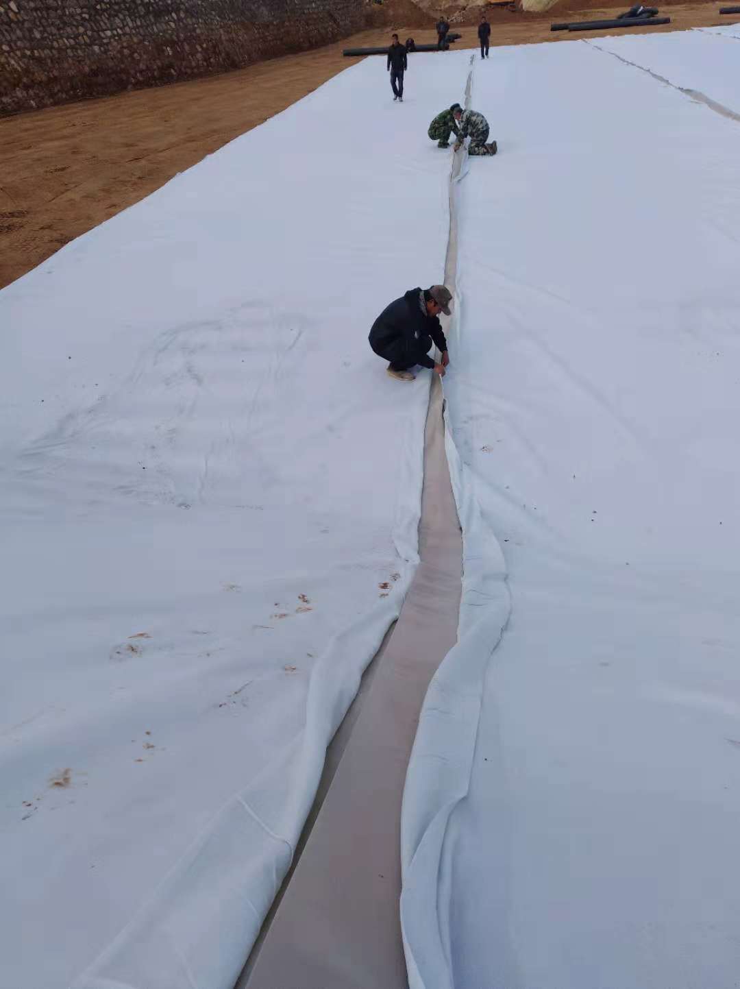 可先在试样上试焊,定出合理的工艺参数再正式焊接。正式焊接时对焊缝要仔细检查,主要看两条焊缝是否清晰、透明,有无气泡、漏焊、熔点或焊缝跑边等。不合格的要进行补焊。布与布缝合方式为肘接。缝合针距以6mm为宜。缝线采用断裂强度为印牛的三股双丝涤纶绞线。应先缝合下层布再缝合上层布。复合橙子视频app在线下载布施工前操作人员经厂家技术培训。由熟练人员操作,平均每个工作面(一台热焊机,一台封边机)每天可铺设橙子视频app在线下载布1200m2,与粘土防渗方案比,工效提高了近50%,而且施工简便,质量有保证。