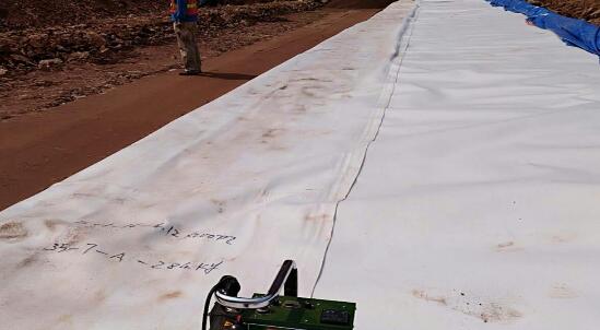 对摆放好准备焊接的膜搭接宽度的检查:该工程选用的双轨焊机搭接宽度要求不小于100mm,考虑焊接时插入设备时的影响,要留有一定的余量。